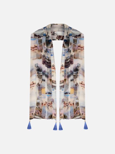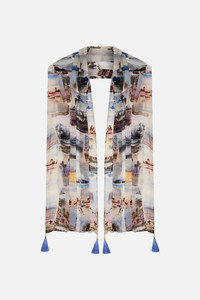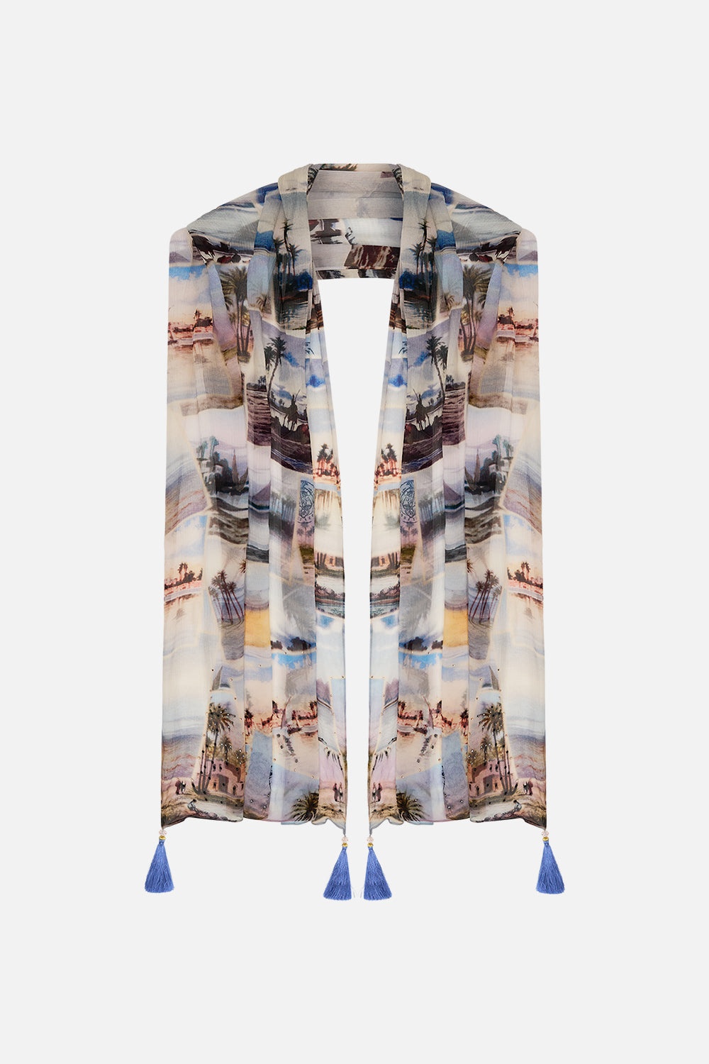 The Call Me In Cairo Long Scarf unfurls an endless oasis luscious palms and majestic pyramids in the distance. This luxury silk scarf showcases a sumptuous rectangular length in a beautifully bespoke print adorned with shimmering crystal embellishments. The custom tassel details add an opulent edge as you drape across your shoulders for evening elegance or wrapped around the neckline for luxurious layering. Explore more from the House Of The Sun collection. - Lovingly Handcrafted - Designed in Australia - CAMILLA Accessories - Rectangular shape - Printed silk - Tassels - Crystals - 200cm x 51cm SKU 00030799-CMEINCAI-O/S Size and Fit Our model wears a CAMILLA O/S and is 5'10 (178cm) tall. Her standard dress size is an AU 10. She has a 32in (83cm) bust, 35in (89.5cm) hips and a 25in (66cm) waist. " - One size style. " Fabric and Care MAIN: 100% SILK Silk crinkle chiffon is a sheer, lightweight fabric with a textured surface, crafted for a fluid drape with delicate stretch and a soft bounce.