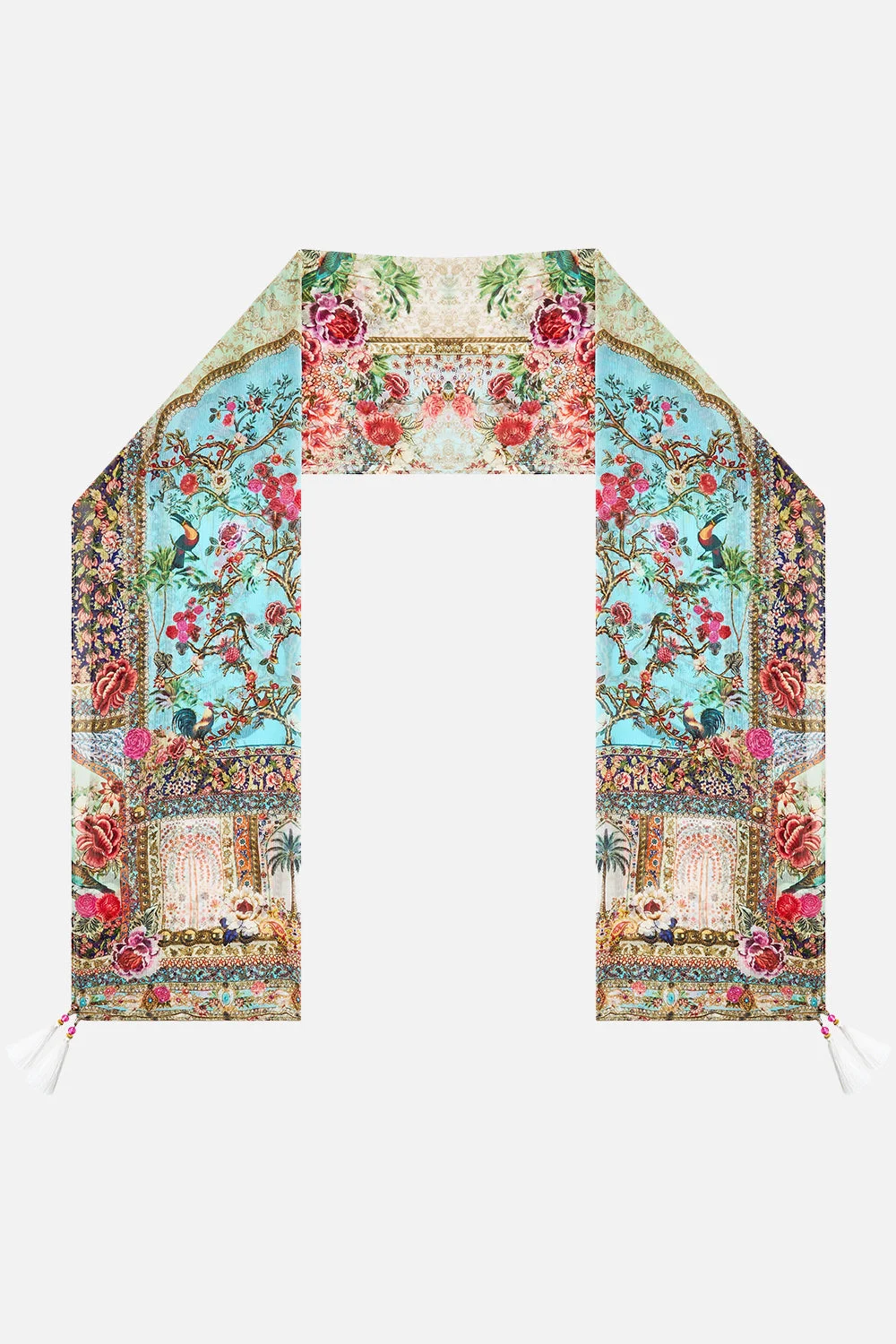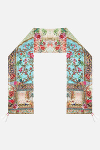 The Sultans And Queens Long Silk Crinkle Chiffon Scarf is a handcrafted silk silhouette designed by our in house artisans. Reimagined in an exclusive limited edition print, our long scarf is adorned with crystals and finished with tassel accents. A flowing layer of colour and shimmer designed to drape, tie or wrap with effortless flair. - 100% Silk - Regular Shape - Printed Silk - Tassels - Crystals - 200cm X 51cm SKU 00039242-SULTQUEN-O/S Size and Fit Our model wears a CAMILLA O/S and is 5'10 (178cm) tall. Her standard dress size is an AU 10. She has a 32in (83cm) bust, 35in (89.5cm) hips and a 25in (66cm) waist. Fabric and Care MAIN: 100% SILK