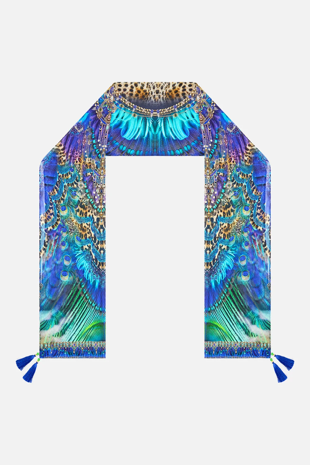 The Cosmic Zoology Long Silk Crinkle Chiffon Scarf is a handcrafted silk silhouette designed by our in house artisans. Reimagined in an exclusive limited edition print, our long scarf is adorned with crystals and finished with tassel accents. A flowing layer of colour and shimmer designed to drape, tie or wrap with effortless flair. - 100% Silk - Regular Shape - Printed Silk - Tassels - Crystals - 200cm X 51cm SKU 00037603-COSMZOOY-O/S Size and Fit Our model wears a CAMILLA O/S and is 5'10 (178cm) tall. Her standard dress size is an AU 10. She has a 32in (83cm) bust, 35in (89.5cm) hips and a 25in (66cm) waist. Fabric and Care MAIN: 100% SILK Silk crinkle chiffon is a sheer, lightweight fabric with a textured surface, crafted for a fluid drape with delicate stretch and a soft bounce.
