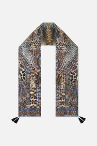 The Istanbul Animalia Long Silk Crinkle Chiffon Scarf is a handcrafted silk silhouette designed by our in house artisans. Reimagined in an exclusive limited edition print, our long scarf is adorned with crystals and finished with tassel accents. A flowing layer of colour and shimmer designed to drape, tie or wrap with effortless flair. - 100% Silk - Regular Shape - Printed Silk - Tassels - Crystals - 200cm X 51cm SKU 00037599-ISTAANIM-O/S Size and Fit Our model wears a CAMILLA O/S and is 5'10 (178cm) tall. Her standard dress size is an AU 10. She has a 32in (83cm) bust, 35in (89.5cm) hips and a 25in (66cm) waist. 0 Fabric and Care MAIN: 100% SILK Silk crinkle chiffon is a sheer, lightweight fabric with a textured surface, crafted for a fluid drape with delicate stretch and a soft bounce.