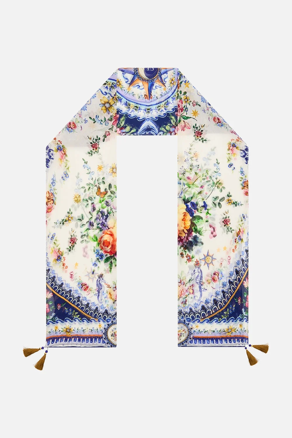 Designed in Australia, the Tiles Darls Long Scarf reads the language of florals and tiles, blue and orange hues intertwine, a celebration of artisan hands and enduring beauty. Lovingly handcrafted, this luxury silk scarf showcases a sumptuous rectangular length in a beautifully bespoke print adorned with shimmering crystal embellishments. The custom tassel details add an opulent edge as you drape across your shoulders or wrapped around the neckline for luxurious layering. - Regular Shape - Printed Silk - Tassels - Crystals - 200CM X 51CM SKU 00035199-TILEDARL-O/S Size and Fit Our model wears a CAMILLA O/S and is 5'10 (178cm) tall. Her standard dress size is an AU 10. She has a 32in (83cm) bust, 35in (89.5cm) hips and a 25in (66cm) waist. Fabric and Care MAIN: 100% SILK Silk crinkle chiffon is a sheer, lightweight fabric with a textured surface, crafted for a fluid drape with delicate stretch and a soft bounce.