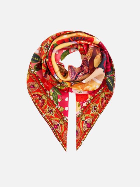 The OlE OlE Long Silk Crinkle Chiffon Scarf is handcrafted by our in-house artisans. Conceived in an exclusive limited edition print, our long scarf is adorned with crystals and finished with tassel accents. A flowing layer of colour and shimmer designed to drape, tie or wrap with effortless flair. - 100% Silk - Regular Shape - Printed Silk - Tassels - Crystals SKU 00040359-OLEOLEEE-O/S Size and Fit Our model wears a CAMILLA O/S and is 5'10 (178cm) tall. Her standard dress size is an AU 10. She has a 32in (83cm) bust, 35in (89.5cm) hips and a 25in (66cm) waist. Fabric and Care 100% SILK Silk crinkle chiffon is a sheer, lightweight fabric with a textured surface, crafted for a fluid drape with delicate stretch and a soft bounce.