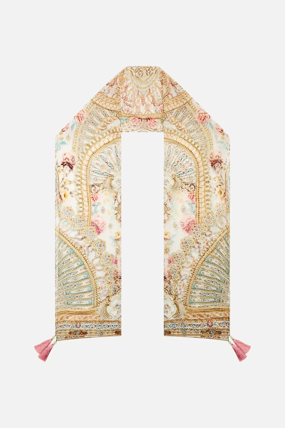 The Ottoman Dynasty Long Silk Crinkle Chiffon Scarf is a handcrafted silk silhouette designed by our in house artisans. Reimagined in an exclusive limited edition print, our long scarf is adorned with crystals and finished with tassel accents. A flowing layer of colour and shimmer designed to drape, tie or wrap with effortless flair. - 100% Silk - Regular Shape - Printed Silk - Tassels - Crystals - 200cm X 51cm SKU 00037596-OTTODYNA-O/S Fabric and Care MAIN: 100% SILK Silk crinkle chiffon is a sheer, lightweight fabric with a textured surface, crafted for a fluid drape with delicate stretch and a soft bounce.