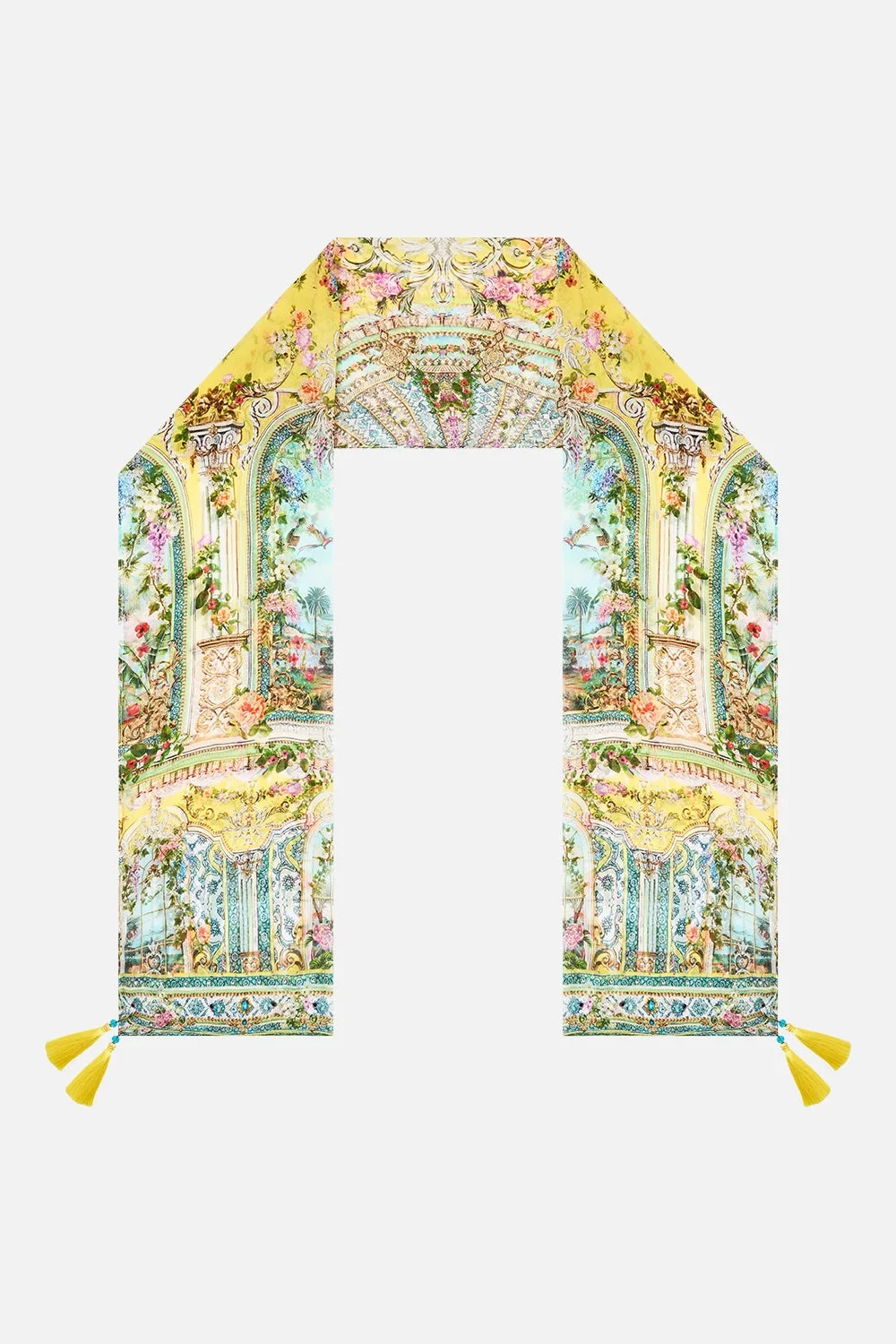 The Tales Of Topkapi Palace Long Silk Crinkle Chiffon Scarf is a handcrafted silk silhouette designed by our in house artisans. Reimagined in an exclusive limited edition print, our long scarf is adorned with crystals and finished with tassel accents. A flowing layer of colour and shimmer designed to drape, tie or wrap with effortless flair. - 100% Silk - Regular Shape - Printed Silk - Tassels - Crystals - 200cm X 51cm SKU 00037597-TALETOPI-O/S Size and Fit Our model wears a CAMILLA O/S and is 5'10 (178cm) tall. Her standard dress size is an AU 10. She has a 32in (83cm) bust, 35in (89.5cm) hips and a 25in (66cm) waist. Fabric and Care MAIN: 100% SILK Silk crinkle chiffon is a sheer, lightweight fabric with a textured surface, crafted for a fluid drape with delicate stretch and a soft bounce.