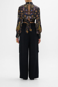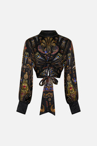 Fabricated with breathtaking precision and awe inspiring luxury, this collector's treasure is a CAMILLA best-selling creation. The Cartouche Kingdom Long Sleeve High Neck Top With Front Knot pays homage to the dark heart of the tombs of ancient kings and the intricate bridge between worlds. This CAMILLA silk cropped blouse features a chic high neckline with back button and keyhole details. The front hemline showcases a twist detail that flows into a generous back tie and the blouson sleeves are finished with embellished cuffs for poetic billow. - Lovingly Handcrafted - Designed in Australia - CAMILLA Ready-To-Wear - Fitted style - Long blouson sleeve with cuff - Front knot with back waist tie - Mirror embroidery detail on cuffs and neckband - Wearable back to front - Cropped length - High neck band with keyhole detail SKU 00030444-CARTKING-XXS Size and Fit Our model wears a CAMILLA S and is 5'10 (178cm) tall. Her standard dress size is an AU 10. She has a 32in (83cm) bust, 35in (89.5cm) hips and a 25in (66cm) waist. Camilla S = AU10 / UK10 / US6 Designed as a true to size fit take your normal size Fabric and Care 100%SILK CHARMEUSE