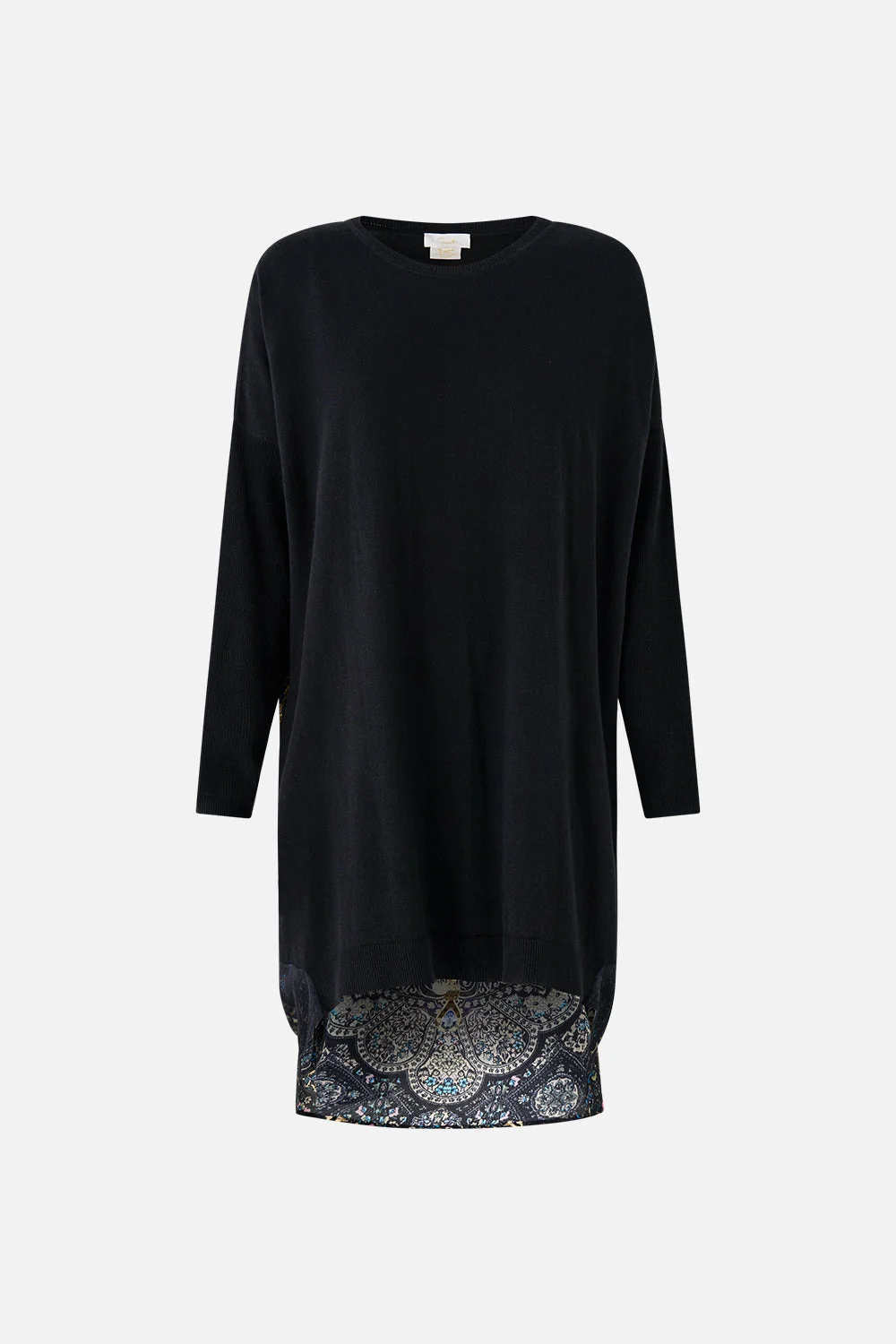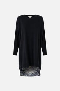 The Song Of The Solstice Long Sleeve Jumper With Print Back is a handcrafted cotton silhouette designed by our in house artisans. Reimagined in an exclusive limited edition print, our long sleeve jumper features a printed silk back panel and a high low hemline. Dropped sleeves and ribbed details elevate this everyday essential. - 70% Cotton, 20% Silk, 10% Cashmere - Drop Sleeve - Rib Details - Silk Back Panel - High Low Hem SKU 00037190-SONGSOLS-O/S Size and Fit Our model wears a CAMILLA O/S and is 5'10 (178cm) tall. Her standard dress size is an AU 10. She has a 32in (83cm) bust, 35in (89.5cm) hips and a 25in (66cm) waist. Fabric and Care 70% COTTON 20%SILK 10% CASHMERE