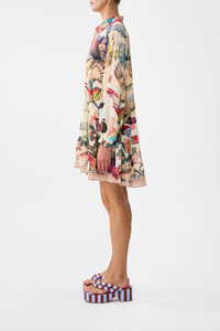 The Notes From The Road Long Sleeve Tiered Short Dress is a handcrafted silk silhouette designed by our in house artisans. Reimagined in an exclusive limited edition print, this relaxed mini dress is paired with luscious blouson sleeves that taper with detailed, elasticated cuffs. It's completed with a button-through front and a gathered tiered skirt for elevated wearability. - Relaxed Fit - Gathered Tiered Skirt - Long Blouson Sleeves With Elasticated Cuffs - Button Through Front SKU 00036820-NOTEROAD-XXS Size and Fit Our model is 5'9 (175cm) tall and is a size XXS (AU 6). Bust: 32in (81cm) Waist: 24in (61cm) Hips: 35in (89cm) Designed as a relaxed fitotake your normal size, or select one size smaller for a neater fit. Fabric and Care 100% SILK With its subtly textured surface, silk crepe is our core fabrication made perfect for versatile wear. With its ability to hold alternative ways to wear, this decadent fabric drapes elegantly off the body whilst keeping you cool with its breathable nature.