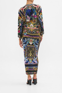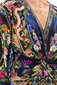 Designed in Australia, the Basked In Baroque Long Split Front Twist Dress celebrates the vivid contrasts of Igreja Matriz De Santa Maria. Painterly prints reflect its dynamic artistry, steeped in timeless energy and colour. Lovingly handcrafted, this CAMILLA jersey midi dress features a relaxed fit throughout the body with a twist drape detail upon the waist. The skirt skims the curves and tapers into a midi length slightly high low hemline with a curved front split for effortless charm. - Fitted Silhouette From Waist Down - Twist Knot Front Design Detail - Loose Sleeve - Front Split - Crystal Embellishment - SKU 00035122-BASKBARO-XXS Size and Fit Designed and fitted true to size, take your normal size. Fabric and Care 92% VISCOSE 8% ELASTANE Viscose is a fibre crafted from the natural substance, cellulose, known for its softness, breathability and drape. It possesses a subtle sheen and is perfect for lightweight soft tailored silhouettes or more structured styles in heavier weights.