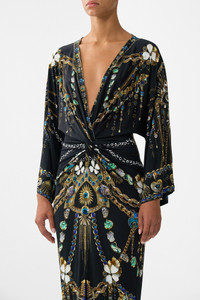 The Amulets And Alchemy Long Split Front Twist Dress is a handcrafted silhouette designed by our in house artisans. Reimagined in an exclusive limited edition print, our maxi front twist dress features a v neckline and flared sleeves. A full length skirt is finished with a front split for dramatic movement. - V Neckline - Midi Length - Long Sleeve - Draped Jersey - Crystal Embellishment SKU 00038833-AMULALCH-XXS Size and Fit Our model is 5'10 (178cm) tall and wears a size S (AU 10). Bust: 40in (101.6cm) Waist: 26.5in (67cm) Hips: 38in (96.5cm) Designed and fitted true to size, take your normal size. Fabric and Care 92% VISCOSE 8% ELASTANE Viscose is a fibre crafted from the natural substance, cellulose, known for its softness, breathability and drape. It possesses a subtle sheen and is perfect for lightweight soft tailored silhouettes or more structured styles in heavier weights.