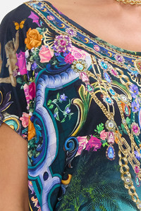 Designed in Australia, the Basked In Baroque Loose Fit Tee dances in pastel hues and vibrant painterly graphics, inspired by the electric beauty of Igreja Matriz De Santa Maria and its radiant frescoes. This luxurious loose-fit tee, featuring a feminine scoop neck and short sleeves, drapes with a relaxed elegance. Adorned with shimmering crystal embellishments, it effortlessly combines opulent sparkle with sublime comfort. - Scoop Neck - Short Sleeve - Relaxed Fit - Crystal Embellishment - SKU 00035588-BASKBARO-XS Fabric and Care 92% MODAL 8% ELASTANE Modal is a bio-based fabric made from beech tree cellulose and considered as an eco-friendly alternative to cotton as production requires 10-20 times less water. Modal is exquisitely soft to the touch, breathable and very durable due to the long fibres and tight weave.