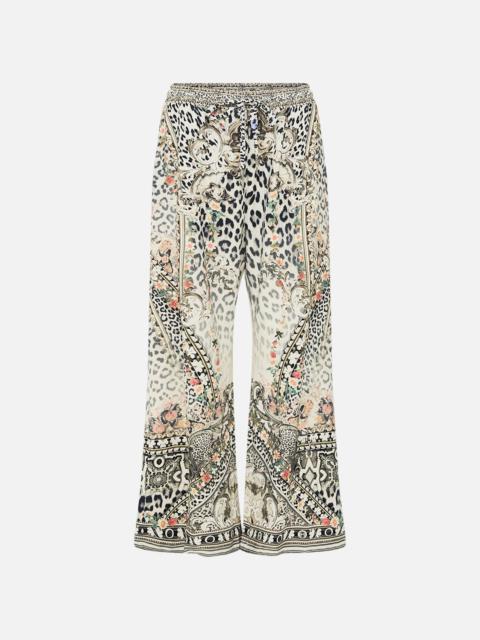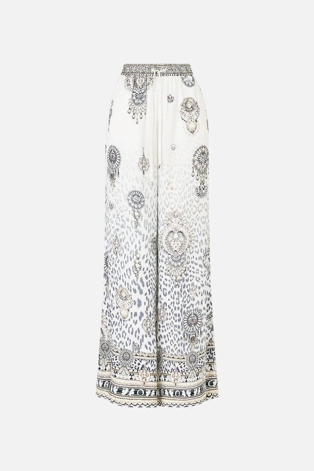 Designed in Australia, the Marble Heaven Lounge Pant dances between leopard prints and marble textures, patterns that glint with opulence, evoking whispers of lost artisans and their inspired creations. Lovingly handcrafted, these sumptuous silk pants capture effortless comfortability with a high waist adjustable band that cascades into a wide leg trouser, sweeping seamlessly at ankle length. - Relaxed Fit - Full Length - Waist Ties With Tassel Charms - Crystal Embellishment SKU 00035618-MARBHEAV-XXS Size and Fit Designed as a relaxed fit—take your normal size, or select one size smaller for a neater fit. Fabric and Care 60% RAYON, 40% VISCOSE, CONTRAST - 100% SILK