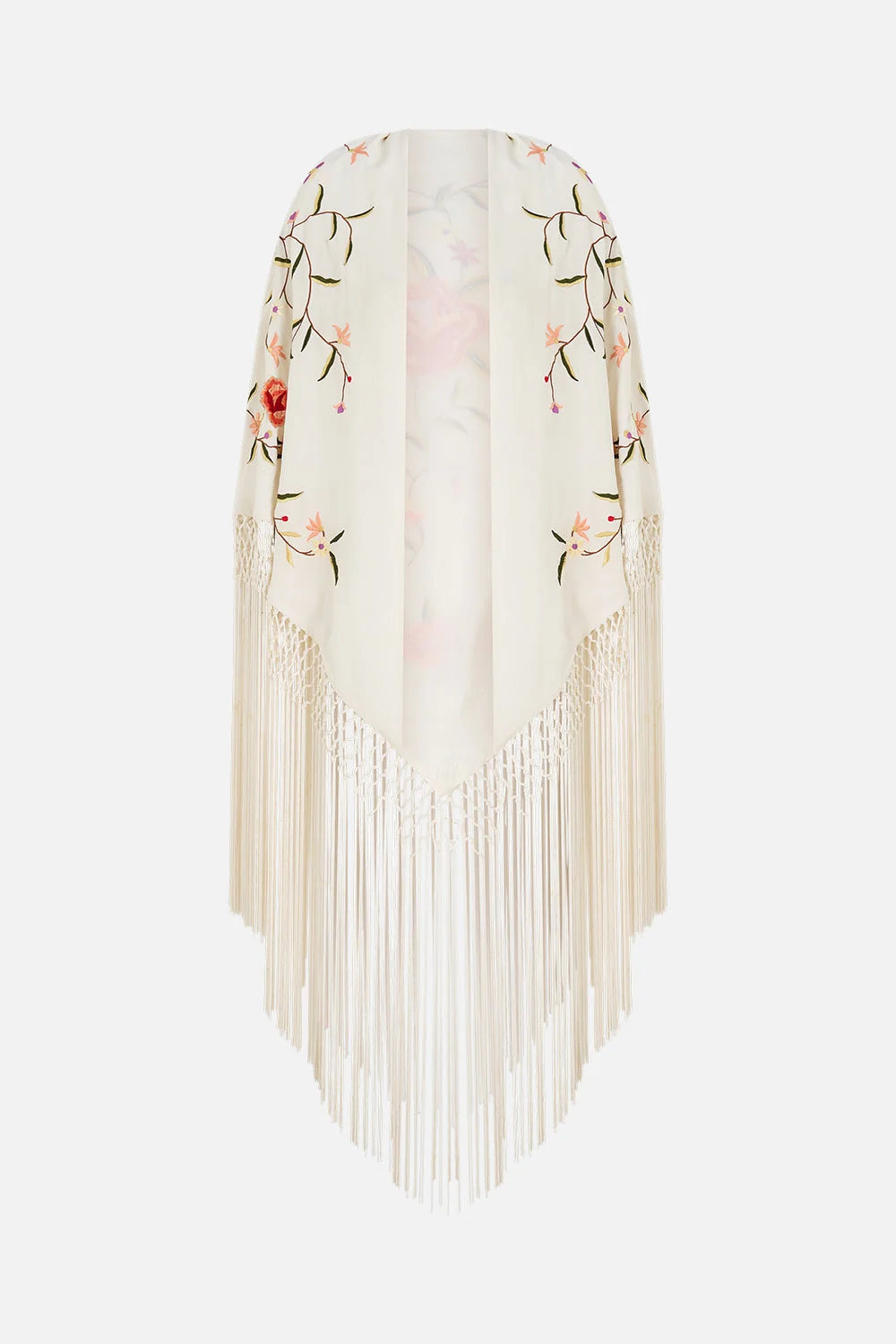 The Solid Cream Macrame Shawl is a handcrafted accessory designed by our in-house artisans. A tapestry of texture that moves beautifully at the dEcolletage, drape yourself in the modern bohemia of our macramE silk shawl. Finished with cascading fringe for a romantic, free-spirited flourish, it layers effortlessly over dresses, separates, or resort wear, adding a touch of artisanal charm to any ensemble. - 100% Silk - Embroidery Feature - Macrame Fringing Feature - Crystals SKU 00040859-SOLCREAM-O/S Size and Fit Our model wears a CAMILLA O/S and is 5'10 (178cm) tall. Her standard dress size is an AU 10. She has a 32in (83cm) bust, 35in (89.5cm) hips and a 25in (66cm) waist. Fabric and Care 100% SILK With its subtly textured surface, silk crepe is our core fabrication made perfect for versatile wear. With its ability to hold alternative ways to wear, this decadent fabric drapes elegantly off the body whilst keeping you cool with its breathable nature.