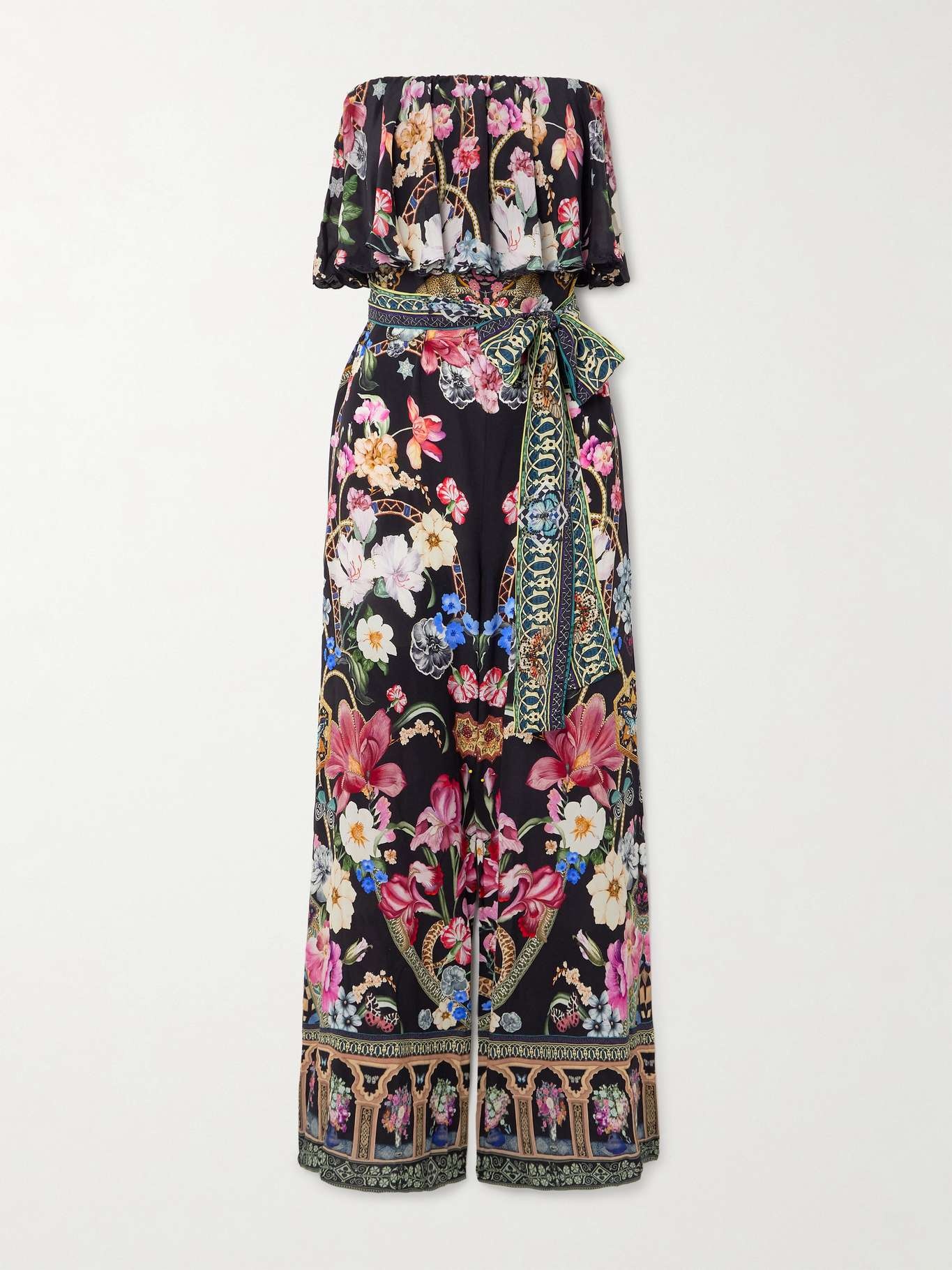 Camilla's jumpsuit is cut from silk crepe de chine printed with beautiful flowers and geometric motifs inspired by gardens and 19th century architecture. It has a ruffled overlay that drapes from the strapless neckline and falls to floaty wide legs. Use the tie belt to cinch the waist. Size & Fit - Fits true to size, take your normal size - Designed to be fitted at the bust and waist with wide-leg pants - Elasticated at the neckline for a flexible fit - Mid-weight, non-stretchy fabric - Model is 175cm/ 5'9" and is wearing a size Small Model measurements: - Bust: 79cm/ 31" - Waist: 66cm/ 26” - Hip: 91cm/ 36” Details & Care - Multicolored silk crepe de chine - Pulls on - 100% silk - Dry clean - Designer color: Midnight in Monserrate