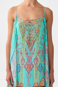 The Concubines Corridor Mini Dress With Long Overlay is a handcrafted silk silhouette designed by our in house artisans. Reimagined in an exclusive limited edition print, our mini dress features an asymmetrical high-low hemline and a cascading overlay with ties, versatile to drape, knot or flow freely. A soft scoop neckline and adjustable straps offer a customisable fit, while it's intricately applied crystal embellishments shimmer with signature CAMILLA opulence. - 100% Silk - Crystal Embellishment - High-Low Hem - Adjustable Straps - Chiffon Overlay With Ties For Multi Wear SKU 00036839-CONCCORR-XXS Size and Fit Our model is 5'10 (178cm) tall and wears a size S (AU 10). Bust: 40in (101.6cm) Waist: 26.5in (67cm) Hips: 38in (96.5cm) Designed as a relaxed silhouette. Take your normal size, or select one size smaller for a neater fit. Fabric and Care SELF-100% SILK CONTRAST-100% SILK With its subtly textured surface, silk crepe is our core fabrication made perfect for versatile wear. With its ability to hold alternative ways to wear, this decadent fabric drapes elegantly off the body whilst keeping you cool with its breathable nature.