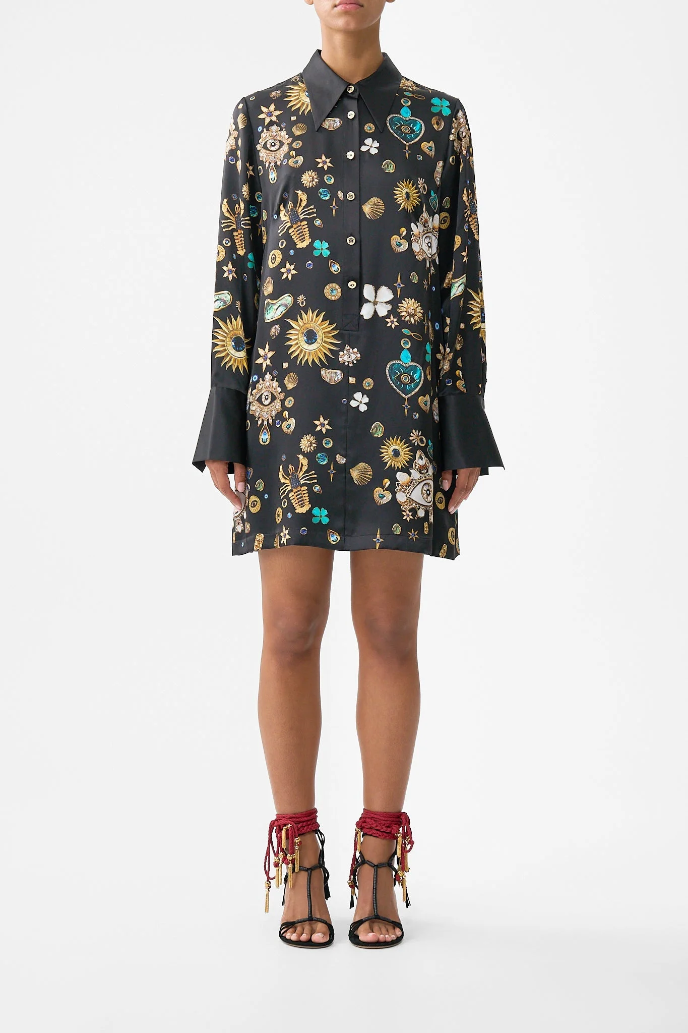 The Amulets And Alchemy Mini Shirt Dress is a handcrafted silhouette designed by our in house artisans. Reimagined in an exclusive limited edition print, our mini shirt dress features elevated collar and cuffed sleeve details. It's finished with intricately placed crystal embellishment. - 100% Silk - Shirt Collar - Short Length - Long Sleeve - Relaxed Fit - Front Button Fastening SKU 00041081-AMULALCH-XXS Size and Fit Our model is 5'10 (178cm) tall and wears a size S (AU 10). Bust: 40in (101.6cm) Waist: 26.5in (67cm) Hips: 38in (96.5cm) Designed and fitted true to size, take your normal size. Fabric and Care 100% SILK Silk satin embodies a sumptuously smooth finish that offers a rich buttery touch to the skin. As a result of the satin weaving technique, it masterfully creates a fuller bounce to the body and drape details.