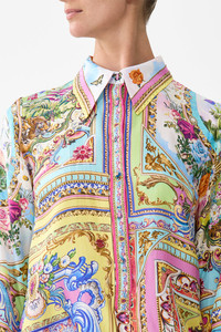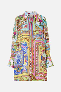 Designed in Australia, the Spirit Of Santa Maria Mini Shirt Dress celebrates the vivid contrasts of Igreja Matriz De Santa Maria. Painterly prints reflect its dynamic artistry, steeped in timeless energy and colour. Lovingly handcrafted, this CAMILLA silk midi dress showcases a sleek square neckline at the front that falls into a straight column silhouette that softly skims the body to a mid-calf hemline. The adjustable straps and centre-back invisible zip accentuate and elongate whilst providing effortless wearability. - Collar Detail - Front Placket - Sleeve Cuff - Crystal Embellishment - Short Length SKU 00035132-SPIRMARI-XXS Size and Fit Designed and fitted true to size, take your normal size. Fabric and Care 100% SILK Silk twill is renowned for its diagonally-patterned weave and fluid texture. Its high thread count ensures rich density and durability, while its beautiful sheen provides a luscious touch to the skin.