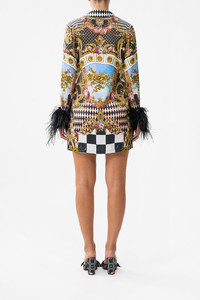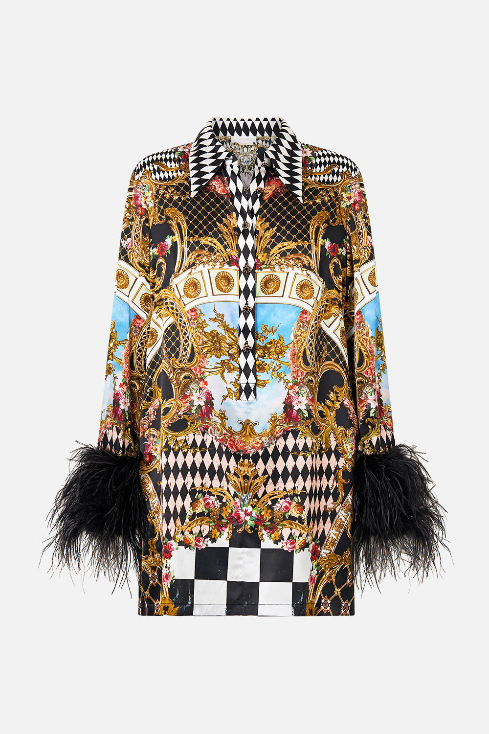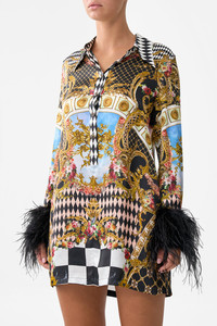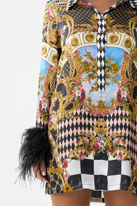 Designed in Australia, The Monarchy Mania Mini Shirt Dress With Feathers Is a nostalgic ode to wanderlust, where tiles and gilded frescoes evoke the charm of vintage postcards and treasured stamps gathered on Camilla’s journeys. Lovingly handcrafted, this mini shirt dress offers a relaxed fit with a refined front placket and elegant collar detail. The front button opening adds a classic touch, while feather cuffs and sparkling crystal embellishments elevate the look, blending casual chic with luxurious sophistication. - Crystal Embellishment - Front Placket - Sleeve Cuff - Collar Detail - Crystal Embellishment - Non-Sheer - Pockets SKU 00034046-MONAMANI-XXS Size and Fit Designed and fitted true to size, take your normal size Fabric and Care 100% SILK Silk satin embodies a sumptuously smooth finish that offers a rich buttery touch to the skin. As a result of the satin weaving technique, it masterfully creates a fuller bounce to the body and drape details.