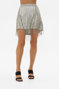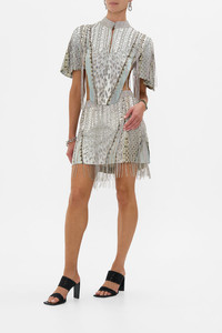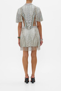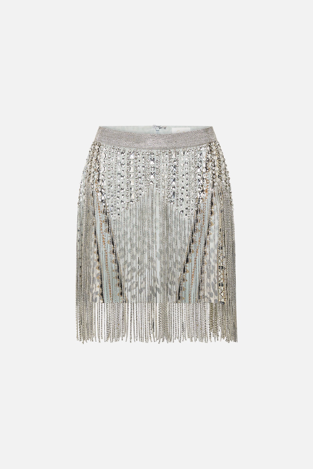 Designed in Australia, The Sahara Starlet Mini Skirt is an ode to the vintage Art Deco motifs of the Egyptian Revival, transcending time with a radiant pearlescent backdrop and intricate gold filigree designs. Adorned with heavy Hand embellished details this luxury CAMILLA mini skirt features a fixed waistband with a slight A line silhouette. The invisible zip enclosure allows effortless wearability while statement details elevates this skirt to timeless treasure status. - Crystal Embellishment - Tailored Fit - Mini Length - Invisible Zip Closure - Fixed Waistband - Heavy Hand Embellishments SKU 00032130-SAHASTAR-XS Size and Fit Our model wears a CAMILLA S and is 5'10 (178cm) tall. Her standard dress size is an AU 10. She has a 32in (83cm) bust, 35in (89.5cm) hips and a 25in (66cm) waist. Camilla S = AU10 / UK10 / US6 Designed and fitted true to size, take normal size. Fabric and Care 100%SILK With its subtly textured surface, silk crepe is our core fabrication made perfect for versatile wear. With its ability to hold alternative ways to wear, this decadent fabric drapes elegantly off the body whilst keeping you cool with its breathable nature.