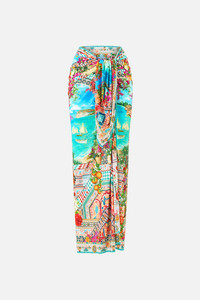 The Meet Me In Mallorca Multi Wear Long Sarong is handcrafted by our in-house artisans. Created in an exclusive limited edition print, our multi wear sarong features an elevated maxi length complete with a relaxed fit. Draping effortlessly across the feminine form. Effortlessly tie our shapeshifting style into bespoke silhouettes. - Long Length - Multiwear - Tie Opening - Swim Cover Up - No Crystal Embellishment SKU 00040709-MEETMALL-O/S Size and Fit Our model wears a CAMILLA O/S and is 5'10 (178cm) tall. Her standard dress size is an AU 10. She has a 32in (83cm) bust, 35in (89.5cm) hips and a 25in (66cm) waist. Designed as a relaxed fit. Take your normal size, or select one size smaller for a neater fit. Fabric and Care 34% RECYCLED NYLON 34% NYLON 32% ELASTANE