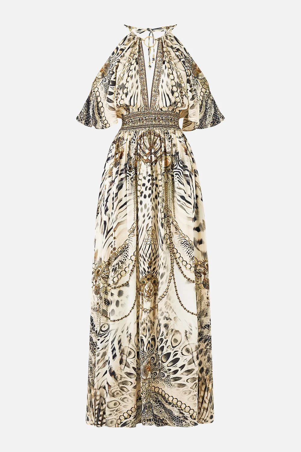The Lady Lionheart Neck Charm Shirred Waist Long Dress is a handcrafted silhouette designed by our in house artisans. Reimagined in an exclusive limited edition print, this maxi dress is crafted with a fitted, shirred waistband and adjustable neck ties for effortless wear. Its adorned with delicate flutter sleeves with splits and hardware for opulent detail and is finished with intricately placed crystal embellishments for luminous, eye catching detail. - 100% Silk - Fitted Shirred Waist - Maxi Length - Adjustable Necktie With Hardware - Flutter Sleeve With Split - Crystal Embellishment - Silk Fabric SKU 00038582-LADYLION-XS Size and Fit Our model is 5'10 (178cm) tall and wears a size S (AU 10). Bust: 40in (101.6cm) Waist: 26.5in (67cm) Hips: 38in (96.5cm) Designed and fitted true to size, take your normal size. Fabric and Care 100% SILK Silk satin embodies a sumptuously smooth finish that offers a rich buttery touch to the skin. As a result of the satin weaving technique, it masterfully creates a fuller bounce to the body and drape details.