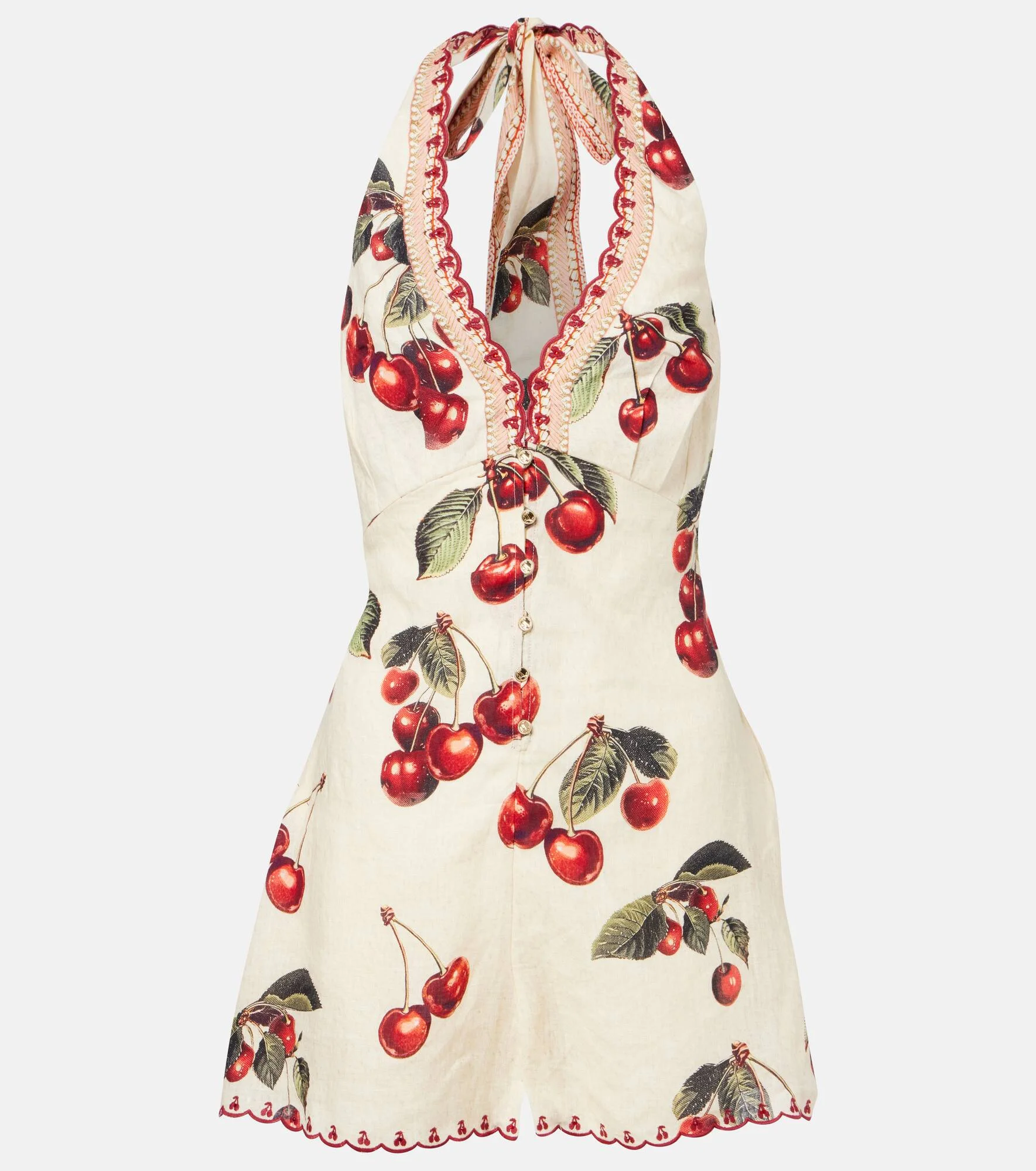 Handcrafted from soft linen, the Notes From The Road romper by Camilla showcases a playful cherry motif. Designed with a flattering V-neckline, this piece features a self-tie halterneck, buttoned front, and a relaxed silhouette. Product Details - Material: 100% linen - Care instructions: dry clean - Made in India - Designer color name: Notes From The Road - Item color: beige, red - Closure: buttoned front - Hardware color: gold - Self-tie neck - Item number: P01093352 Size & Fit - True to size - Low back - Elasticated top - Cinched waist - Non-stretchy fabric - Wide-leg - The model seen in the picture is 178cm-5'10" and wearing a size XS