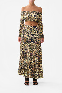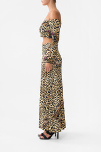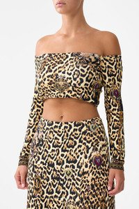Designed in Australia, The Saints And Sisters Off Shoulder Cropped Jersey Top celebrates Portugal’s architectural grandeur with a touch of the wild—leopard print meets sacred artistry, blending nostalgia and wanderlust in every hand-illustrated design. Lovingly handcrafted, this off-shoulder cropped jersey top features a fitted silhouette with long sleeves and crystal embellishments for effortless glamour. - Fitted Style - Long Off-Shoulder Sleeve - Crystal Embellishment - Cropped Silhouette - Crystal Embellishment - Non-Sheer SKU 00033688-SAINSIST-XXS Size and Fit Designed and fitted true to size, take your normal size Fabric and Care 96% RAYON 4% ELASTANE Rayon spandex crepe embodies medium weight and structure. The slightly textured surface and subtle stretch create lavishly sleek silhouettes with soft tailored elements.