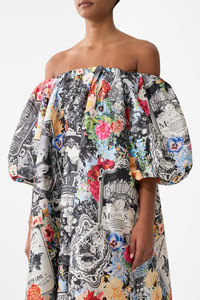 Designed in Australia, the Flower Showers Off Shoulder Long Puff Dress captures the essence of handcrafted soap packaging with painterly graphics—a kaleidoscope of hues to brighten your day. Lovingly handcrafted, this maxi dress features elegant 3/4 sleeves with elasticated hems and a softly gathered neck edge. Adorned with dazzling crystal embellishments, it offers a perfect blend of opulence and allure. - Relaxed Fit - 3/4 Sleeve Length - Elasticated Neck Edge - Elasticated Sleeve Hem SKU 00034946-FLOWSHOW-XS Size and Fit Our model wears a CAMILLA S and is 5'10 (178cm) tall. Her standard dress size is an AU 10. She has a 32in (83cm) bust, 35in (89.5cm) hips and a 25in (66cm) waist. Camilla S = AU10 / UK10 / US6 Fabric and Care 100% POLYESTER Taffeta fabric is crisp and lightweight. It holds it shape to create beautifully structured silhouettes as a result of the tightly twisted yarns woven together to create a smooth lustrous surface.