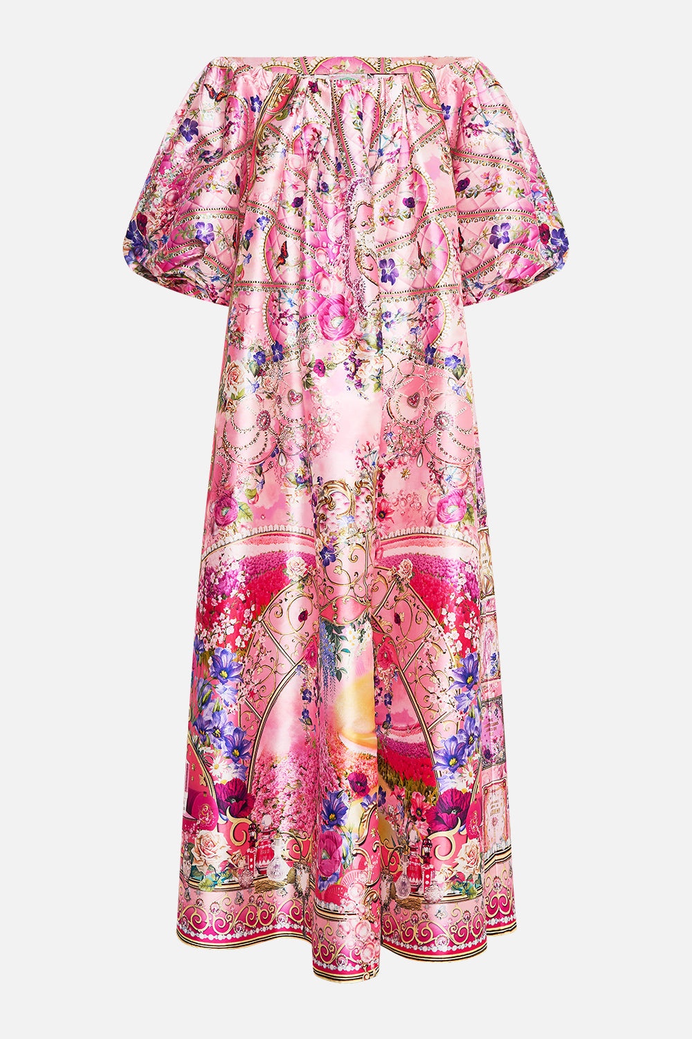 Designed in Australia, The Totally Ozmopolitan Off Shoulder Long Puff Dress unveils a fantastical realm where storytelling defies gravity, weaving a symphony of bubbles, butterflies, and tarot cards against a perfectly pink sky. Every detail pays homage to enchanting femininity and the gentle charm of a benevolent witch. Lovingly handcrafted, this maxi dress features elegant 3/4 sleeves with elasticated hems and a softly gathered neck edge. Adorned with dazzling crystal embellishments, it offers a perfect blend of sophistication and allure. - 3/4 Sleeve Length - Elasticated Neck Edge - Elasticated Sleeve Hem - Crystal Embellishment - Maxi Length SKU 00036388-GLINDALN-XS Size and Fit Our model wears a CAMILLA S and is 5'10 (178cm) tall. Her standard dress size is an AU 10. She has a 32in (83cm) bust, 35in (89.5cm) hips and a 25in (66cm) waist. Camilla S = AU10 / UK10 / US6 Fabric and Care 100% POLYESTER Taffeta fabric is crisp and lightweight. It holds it shape to create beautifully structured silhouettes as a result of the tightly twisted yarns woven together to create a smooth lustrous surface.