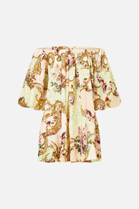 Designed in Australia, The Queens Quarters Off Shoulder Puff Dress is inspired by the interiors of the Palace of Queluz—framed florals, ornate borders, and intricate ceiling and floor details echo its regal charm. Lovingly handcrafted, this show-stopping statement party dress features bold puff sleeves that dance at elbow length, an off the body billowy fit dances at mini length. - Elasticated Sleeve Hem - 3/4 Sleeve Length - Elasticated Neck Edge - Crystal Embellishment - Crystal Embellishment - Pockets - Short Length SKU 00036063-QUARQUEN-XXS Size and Fit Our model wears a CAMILLA S and is 5'10 (178cm) tall. Her standard dress size is an AU 10. She has a 32in (83cm) bust, 35in (89.5cm) hips and a 25in (66cm) waist. Camilla S = AU10 / UK10 / US6 Designed as a relaxed fit, take your normal size or select one size smaller for a neater fit Fabric and Care 80%LINEN,20% SILK Grown organically, this lightweight natural fibre offers a timeless aesthetic that adds durability and longevity to any wardrobe. Its breathability keeps your skin cool, minimises moisture and ensures effortless comfort.