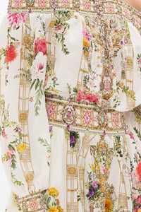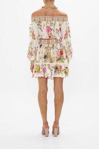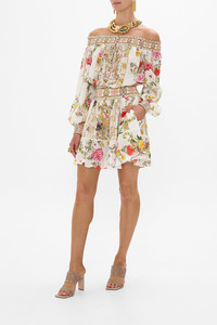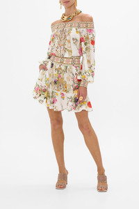 Designed in Australia, The Egyptian Rose Off Shoulder Short Dress captures an enchanting oasis where lush florals entwine with majestic interiors amid a serene, pearlescent setting. Lovingly handcrafted, this luxury silk off-the-shoulder dress features a shirred elastic neckline that falls into a blousy bodice, elegantly cinching into an adjustable waistband. The soft gathered skirt flares into a wide ruffle hemline that dances playfully at mid-thigh level. - Crystal Embellishment - Mini Flared Hem - Shirred Neckline, Waistband And Cuffs - Blouson Sleeves - Raglan Cut SKU 00034448-EGYPROSE-XXS Size and Fit Our model wears a CAMILLA S and is 5'10 (178cm) tall. Her standard dress size is an AU 10. She has a 32in (83cm) bust, 35in (89.5cm) hips and a 25in (66cm) waist. Camilla S = AU10 / UK10 / US6 Designed as a relaxed fit, take your normal size or select one size smaller for a neater fit Fabric and Care 100% SILK With its subtly textured surface, silk crepe is our core fabrication made perfect for versatile wear. With its ability to hold alternative ways to wear, this decadent fabric drapes elegantly off the body whilst keeping you cool with its breathable nature.