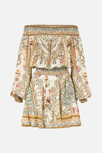 The Ottoman Dynasty Off Shoulder Short Dress is a handcrafted silk silhouette designed by our in house artisans. Reimagined in an exclusive limited edition print, our off the shoulder mini dress features a shirred waistband, neckline and cuffs for an adjustable, cinched fit. Feminine blouson sleeves and a flared hemline add soft volume, whilst crystal embellishments add subtle sparkle. - 100% Silk - Crystal Embellishment - Shirred Neckline, Waistband And Cuffs - Blouson Sleeve - Flared Hem SKU 00036792-OTTODYNA-XXS Size and Fit Our model is 5'10 (178cm) tall and wears a size S (AU 10). Bust: 40in (101.6cm) Waist: 26.5in (67cm) Hips: 38in (96.5cm) Designed as a relaxed fit, take your normal size, or select one size smaller for a neater fit. Fabric and Care 100% SILK C-100% SILK C1-100% SILK With its subtly textured surface, silk crepe is our core fabrication made perfect for versatile wear. With its ability to hold alternative ways to wear, this decadent fabric drapes elegantly off the body whilst keeping you cool with its breathable nature.
