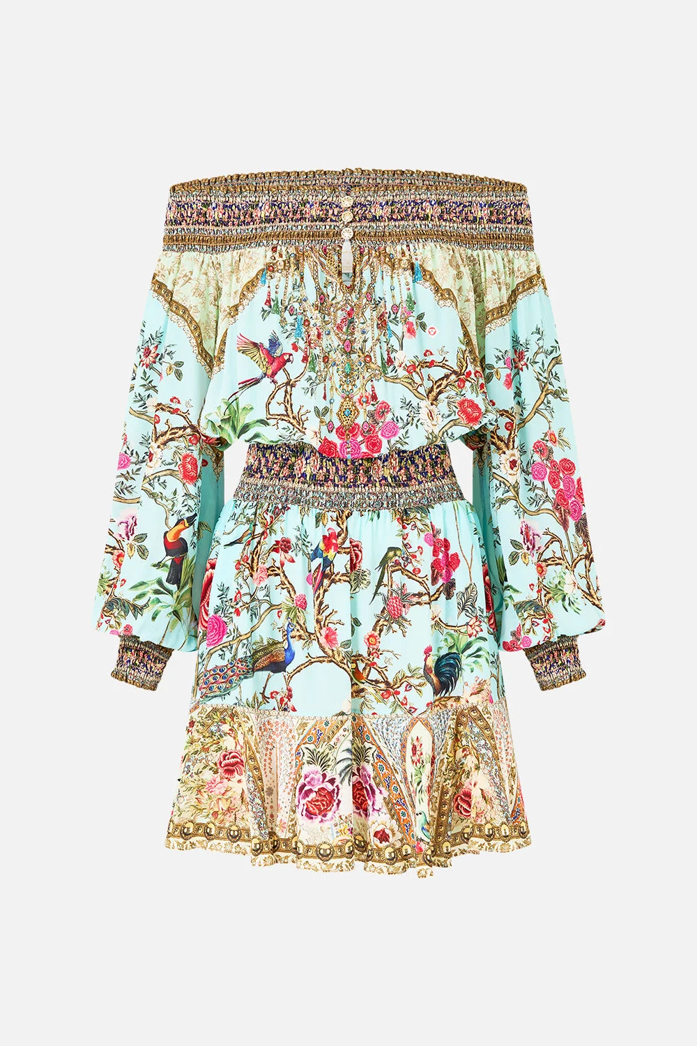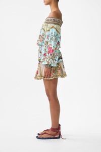 The Sultans And Queens Off Shoulder Short Dress is a handcrafted silk silhouette designed by our in house artisans. Reimagined in an exclusive limited edition print, our off the shoulder mini dress features a shirred waistband, neckline and cuffs for an adjustable, cinched fit. Feminine blouson sleeves and a flared hemline add soft volume, whilst crystal embellishments add subtle sparkle. - 100% Silk - Crystal Embellishment - Shirred Neckline, Waistband And Cuffs - Blouson Sleeve - Flared Hem SKU 00038522-SULTQUEN-XXS Size and Fit Our model is 5'10 (178cm) tall and wears a size S (AU 10). Bust: 40in (101.6cm) Waist: 26.5in (67cm) Hips: 38in (96.5cm) Designed as a relaxed fit. Take your normal size, or select one size smaller for a neater fit. Fabric and Care 100% SILK Designed as a relaxed fit. Take your normal size, or select one size smaller for a neater fit.