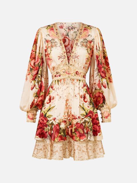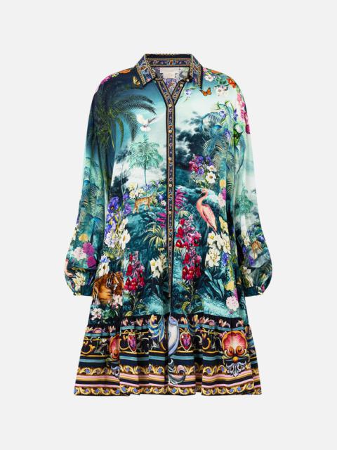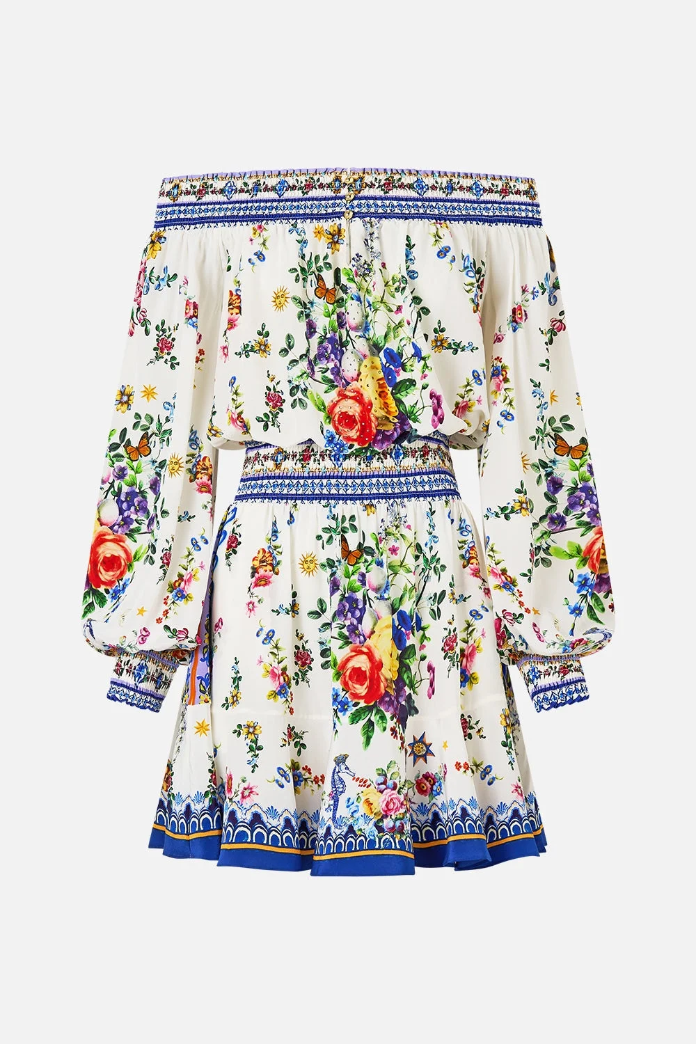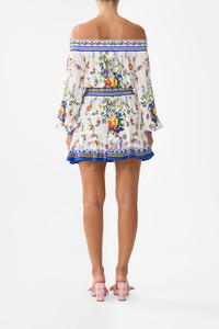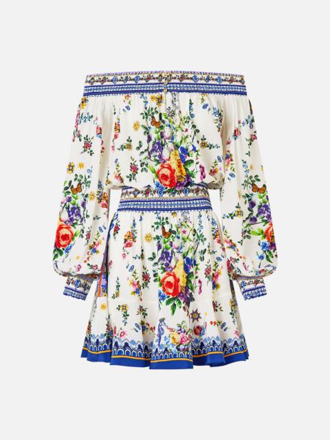 Designed in Australia, the Tiles Darls Off Shoulder Short Dress reads the language of florals and tiles, blue and orange hues intertwine, a celebration of artisan hands and enduring beauty. Lovingly handcrafted, this luxury silk off-the-shoulder dress features a shirred elastic neckline that falls into a blousy bodice, cinching into an adjustable waistband. The soft gathered skirt flares into a wide ruffle hemline that dances playfully at mid-thigh level. - Crystal Embellishment - Shirred Neckline, Waistband And Cuffs - Blouson Sleeve - Flared Hem SKU 00035220-TILEDARL-XXS Size and Fit Designed as a relaxed fit—take your normal size, or select one size smaller for a neater fit. Fabric and Care 100% SILK With its subtly textured surface, silk crepe is our core fabrication made perfect for versatile wear. With its ability to hold alternative ways to wear, this decadent fabric drapes elegantly off the body whilst keeping you cool with its breathable nature.
