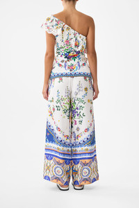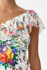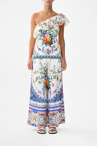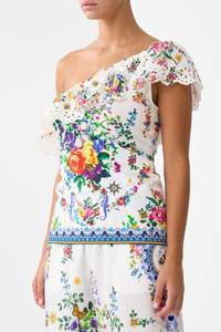 Designed in Australia, the Tiles Darls One Shoulder Fitted Jersey Tank reads the language of florals and tiles, blue and orange hues intertwine, a celebration of artisan hands and enduring beauty. Lovingly handcrafted, this one-shoulder fitted jersey tank features frill and broderie details, creating a romantic and textured design. Crystal embellishments enhance its allure, making it an ideal choice for both day and evening wear. - Fitted - One Shoulder Design - Frill With Broderie Detail - Crystal Embellishment SKU 00035566-TILEDARL-XS Size and Fit Our model wears a CAMILLA S and is 5'10 (178cm) tall. Her standard dress size is an AU 10. She has a 32in (83cm) bust, 35in (89.5cm) hips and a 25in (66cm) waist. Camilla S = AU10 / UK10 / US6 Fabric and Care 95% COTTON PIMA, 5% SPANDEX