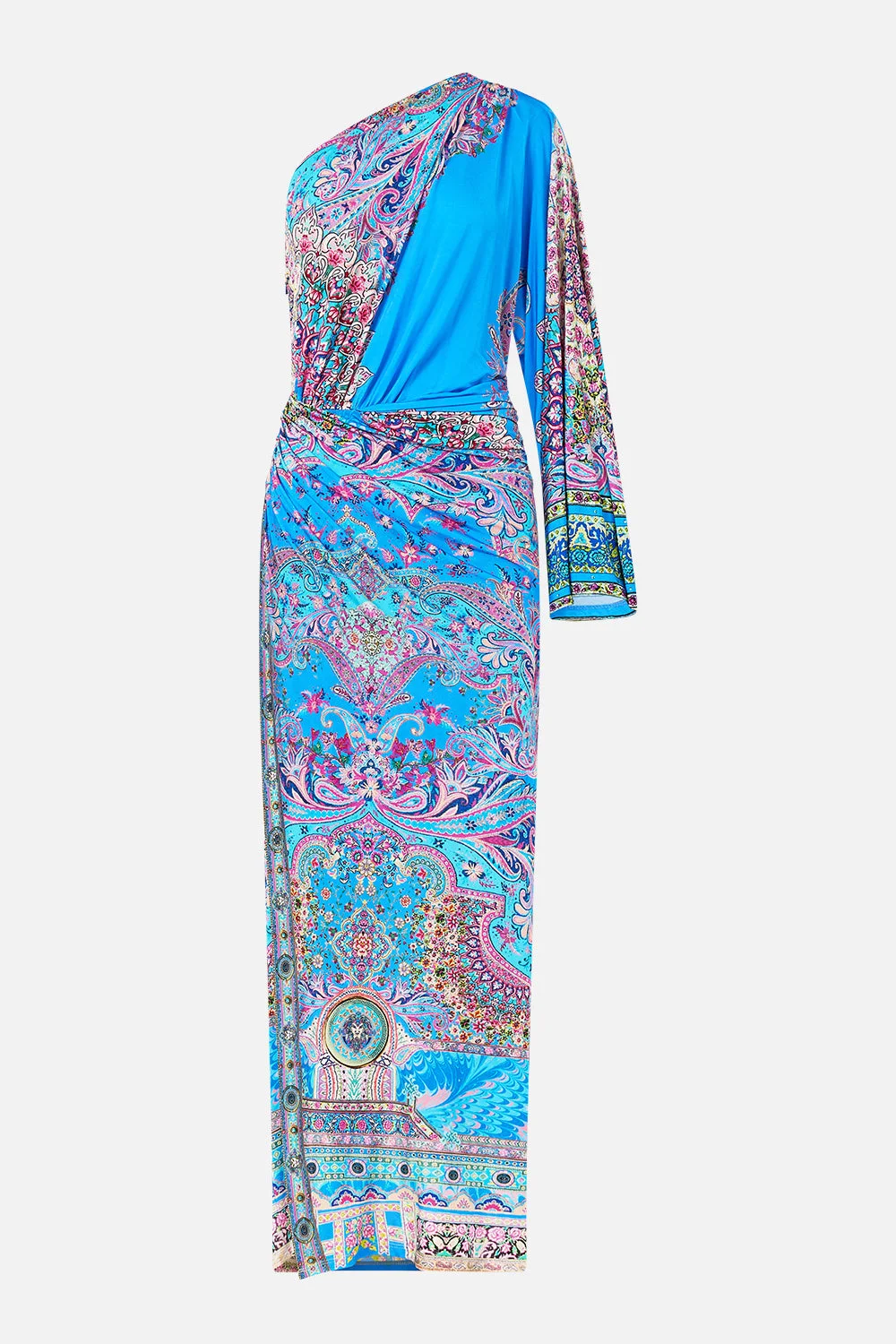 The Footsteps In Folklore One Shoulder Jersey Dress is a handcrafted silhouette designed by our in house artisans. Reimagined in an exclusive limited edition print, this one shoulder dress features an asymmetrical wide sleeve that falls to wrist length. A side split drapes across the form to honour the feminine form and it's finished with intricately placed crystal embellishments for luminous detail. - 92% Viscose, 8% Elastane - Draped Detail - Side Split - Wide Sleeve - Crystal Embellishment SKU 00037052-FOOTFOLT-XS Size and Fit Our model is 5'10 (178cm) tall and wears a size S (AU 10). Bust: 40in (101.6cm) Waist: 26.5in (67cm) Hips: 38in (96.5cm) Designed and fitted true to size, take your normal size. Fabric and Care 92% VISCOSE 8% ELASTANE Viscose is a fibre crafted from the natural substance, cellulose, known for its softness, breathability and drape. It possesses a subtle sheen and is perfect for lightweight soft tailored silhouettes or more structured styles in heavier weights.