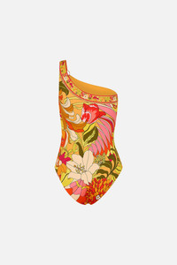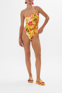 The Flower Child Society One Shoulder One Piece depicts a 70's inspired scene of vibrant orange imbued with statement retro florals. This luxury one piece swimsuit features a fitted silhouette. The one shoulder strap features a custom ring detail to create a statement focal point. Explore more from the Wonderkind collection. - Lovingly Handcrafted - Designed in Australia - ECONYL® swim - Fits b-c cup - Removable soft cups - One shoulder style - Ring trim detail - Sustainable swimwear SKU 00028348-FLOWCHIL-XS Size and Fit Our model wears a CAMILLA S and is 5'10 (178cm) tall. Her standard dress size is an AU 10. She has a 32in (83cm) bust, 35in (89.5cm) hips and a 25in (66cm) waist. Camilla S = AU10 / UK10 / US6 Fabric and Care 82% REGENERATED POLYAMIDE, 18% ELASTANE ECONYL® is an eco-friendly regenerated nylon made entirely from items such as old fishing nets, and industrial plastic recovered from our oceans. ECONYL® is strong, lightweight, and elastic which makes it the perfect fabric for form fitting styles. Its sustainability and water repellent qualities provide a luxurious base for bespoke CAMILLA swimwear.