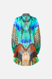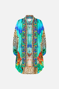 The Jungle Flight Open Front Cardi Cape is a handcrafted silk silhouette designed by our in house artisans. Reimagined in an exclusive limited edition print, this cardigan is relaxed fitting and effortlessly drapes to a hip length hemline. It features a cape style cut and is adorned with short sleeves that meet a contrasting neckline. It's finished with crystal embellishments for decadent, eye catching detail. - 100% Silk - Relaxed It - Draped Style - Loose Fit - Crystal Embellishment SKU 00041140-JUNGFLHT-O/S Size and Fit Our model wears a CAMILLA O/S and is 5'10 (178cm) tall. Her standard dress size is an AU 10. She has a 32in (83cm) bust, 35in (89.5cm) hips and a 25in (66cm) waist. Designed as a relaxed fit. Take your normal size, or select one size smaller for a neater fit. Fabric and Care SELF-100% SILK, CONTRAST-100% SILK A featherlight, sheer, material renowned for its delicate flow and graceful drape, silk flat chiffon creates a softly cascading silhouette with a subtle lustre.