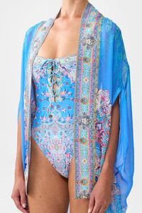 The Footsteps In Folklore Open Front Cardi Cape is a handcrafted silk silhouette designed by our in house artisans. Reimagined in an exclusive limited edition print, this cardigan is relaxed fitting and effortlessly drapes to a hip length hemline. It features a cape style cut and is adorned with short sleeves that meet a contrasting neckline. It's finished with crystal embellishments for decadent, eye catching detail. - 100% Silk - Relaxed Fit - Draped Style - Short Sleeve - Crystal Embellishment SKU 00039502-FOOTFOLT-O/S Size and Fit Our model wears a CAMILLA O/S and is 5'10 (178cm) tall. Her standard dress size is an AU 10. She has a 32in (83cm) bust, 35in (89.5cm) hips and a 25in (66cm) waist. Designed as a relaxed fit. Take your normal size, or select one size smaller for a neater fit. Fabric and Care 100% SILK A featherlight, sheer, material renowned for its delicate flow and graceful drape, silk flat chiffon creates a softly cascading silhouette with a subtle lustre.