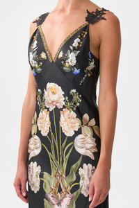 The Ottoman Elegance V Neck Full Length Bias Slip Dress is a handcrafted silk silhouette designed by our in house artisans. Reimagined in an exclusive limited edition print, our maxi slip dress is adorned with a shaped panel bustline that falls into a skimming bodice that gently cascades into a floor length hemline. Adjustable straps and deep V back neckline offer a sleek silhouette with effortless allure. - 100% Silk - Slim Fit - Full Length - Deep V Back - Bias Cut SKU 00036579-OTTOELEG-XXS Size and Fit Our model is 5'10 (178cm) tall and wears a size S (AU 10). Bust: 40in (101.6cm) Waist: 26.5in (67cm) Hips: 38in (96.5cm) Fabric and Care 100% SILK CHARMEUSE Silk satin embodies a sumptuously smooth finish that offers a rich buttery touch to the skin. As a result of the satin weaving technique, it masterfully creates a fuller bounce to the body and drape details.