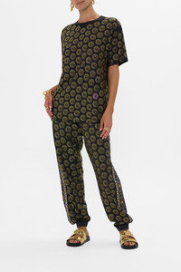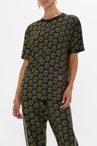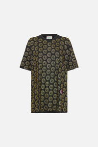 Designed in Australia, The Defy Gravity Oversized Band Tee - Black beckons you to the decadently enchanted land of Oz, where opulent gold embellishments and extravagant borders cascade through a bewitching realm, intertwining with dazzling greens and teals. Lovingly handcrafted, this luxury graphic tee features a relaxed oversized fit throughout the body that falls to a slightly longer line silhouette. The timeless round neckline and relaxed short sleeves paired with a bespoke placement print embodies understated everyday elegance. - Crystal Embellishment - Rhinestone Embellishment - Round Neckline - Oversized Fit - Hand Embroidery SKU 00037924-ELPHABAJ-XS Size and Fit Our model wears a CAMILLA S and is 5'10 (178cm) tall. Her standard dress size is an AU 10. She has a 32in (83cm) bust, 35in (89.5cm) hips and a 25in (66cm) waist. Camilla S = AU10 / UK10 / US6 Designed as a relaxed fit, take your normal size or select one size smaller for a neater fit Fabric and Care 100% ORGANIC COTTON