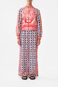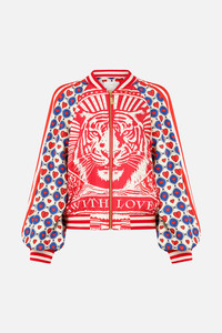 Designed in Australia, the Rinse & Roar Panelled Sleeve Blouson Bomber prowls with daring contrasts, tigers emerge amidst red and blue strokes creating a monochromatic masterpiece of wild wonder. Lovingly handcrafted, this bomber jacket features a detailed body and voluminous blouson sleeves. Ribbed collar, cuffs, and waist create shape, while functional front pockets complete the design. - Blouson Sleeve - Rib Neck + Cuffs + Waist - Detailed Panel Body - Front Pockets SKU 00035924-RINSROAR-XS Fabric and Care SELF- 100% SILK. CONTRAST-83% VISCOSE, 17% POLYESTER. LINING-100% CUPRO Silk twill is renowned for its diagonally-patterned weave and fluid texture. Its high thread count ensures rich density and durability, while its beautiful sheen provides a luscious touch to the skin.