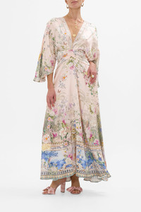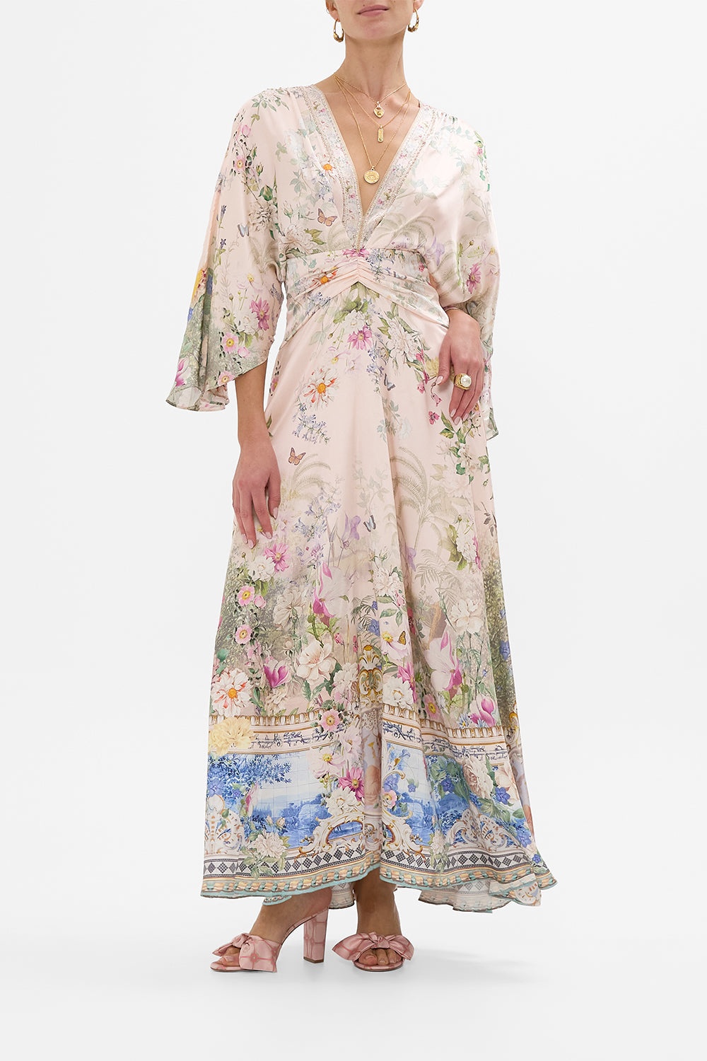 Designed in Australia, The Palacio Playground Petal Sleeve Long Dress draws from Portugal's Pink Palace, the Palacio De Estoi, celebrating a rococo facade, grand arches, and Versailles-style gardens. Lovingly handcrafted, this petal sleeve long dress is an ode to timeless elegance. A fitted waist flows into a sweeping full skirt, while kimono sleeves and a keyhole back with button detail create a silhouette of refined grace. - Fitted Waist - Long Full Skirt - Keyhole Back With Button And Invisible Zip - Long Kimono Sleeves - Crystal Embellishment - Tie Front - Non-Sheer SKU 00033554-PLCIPLAY-XXS Size and Fit Fitted True to Size Fabric and Care 100%SILK CHARMEUSE Silk satin embodies a sumptuously smooth finish that offers a rich buttery touch to the skin. As a result of the satin weaving technique, it masterfully creates a fuller bounce to the body and drape details.