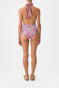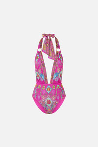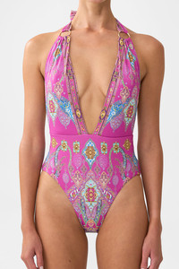 The Concubines, Sultans & Courtiers Plunge Front Low Back Halter Neck One Piece With Rings is a handcrafted silhouette designed by our in house artisans. Reimagined in an exclusive limited edition print, our low back halter one piece is made with B to C cups in mind. Featuring soft removable cups, a plunging neckline and an open back, it ties gently at the neck with ring hardware accents. Crystal embellishments finish the look with a touch of luminous detail. - Fits B-C Cup - Removable Soft Cups, Plunge Neckline - High Leg Line, Moderate Bottom Coverage - Low Back - Soft Neck Tie With Ring Trim Detail - Crystal Embellishment SKU 00037486-CONCSULT-XS Size and Fit Our model is 5'10 (178cm) tall and wears a size S (AU 10). Bust: 40in (101.6cm) Waist: 26.5in (67cm) Hips: 38in (96.5cm) Fabric and Care MAIN: 82% REGENERATED POLYAMIDE, 18% ELASTANE ECONYL® is regenerated nylon, crafted from waste materials that would otherwise end up polluting our Mother Earth. Its beauty lies in its ability to be recycled, remoulded and ultimately reused time and time again. An infinitely recyclable product that keeps our planet looking beautiful, it opens the door to a circular fashion sphere.