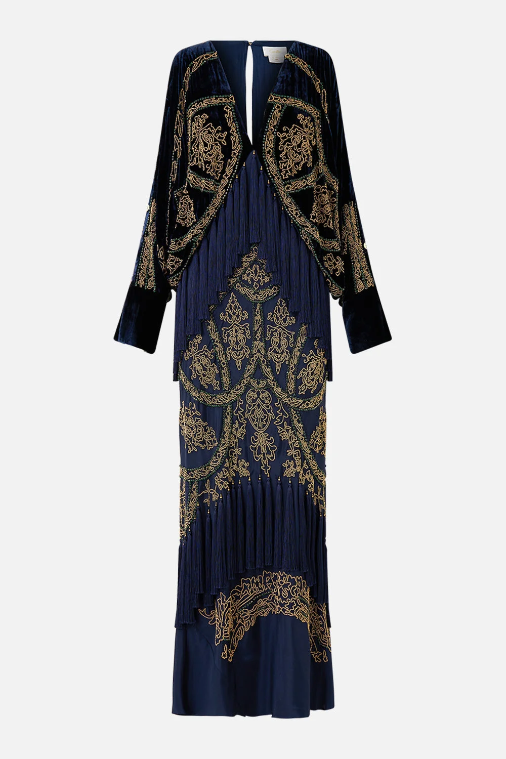 Taking 180 hours to craft, this exquisite draped shoulder dress is a true celebration of craftsmanship and creativity, featuring a rich mix of textures and artistry. The silhouette is meticulously hand-embroidered with intricate seed beadwork in varying sizes, radiant rhinestones and delicate silk tassels— each embellishment thoughtfully placed across the garment. A luminous fusion of detail and design, this dress is a wearable work of art. The The Imperial Gate Plunge Neck Draped Shoulder Dress is a handcrafted silk silhouette designed by our in house artisans. Reimagined in an exclusive limited edition print, our draped shoulder dress features a decadent velvet bodice framed by a flattering V neckline. Its elevated with exposed shoulder detail for subtle allure and finished with intricate hand beaded embellishments. - 100% Silk - Hand Beaded Embellishment - Velvet Bodice - V Neckline - Exposed Shoulder SKU 00037870-IMPEGATE-S Size and Fit Our model is 5'10 (178cm) tall and wears a size S (AU 10). Bust: 40in (101.6cm) Waist: 26.5in (67cm) Hips: 38in (96.5cm) Designed and fitted true to size, take your normal size. Fabric and Care 100% SILK With its subtly textured surface, silk crepe is our core fabrication made perfect for versatile wear. With its ability to hold alternative ways to wear, this decadent fabric drapes elegantly off the body whilst keeping you cool with its breathable nature.
