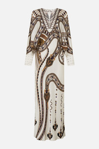 Fabricated with breathtaking precision and awe inspiring luxury, this collector's treasure is a CAMILLA best-selling creation. Designed in Australia, The Goddess Energy Plunge Neck Draped Shoulder Dress exudes enchantress vivacity with opulent tonal gold and metallic detailing and lotus and snake motifs, imbued on a white canvas. Lovingly handcrafted, this CAMILLA silk maxi dress features a slight blousy fit throughout the body with a slightly flared skirt that falls to a full length hemline. With a chic plunge V neckline, elegant exposed shoulder details paired with the drapey long sleeves, this lavish silk maxi dress exudes lavish opulence. - Silk Satin Fabric - Crystal Embellishment - Cuff Detail - Exposed Shoulder - Drape Details - V Neck SKU 00031343-GODENERG-XS Size and Fit Our model wears a CAMILLA S and is 5'10 (178cm) tall. Her standard dress size is an AU 10. She has a 32in (83cm) bust, 35in (89.5cm) hips and a 25in (66cm) waist. Camilla S = AU10 / UK10 / US6 Designed as a relaxed fit, take your normal size or select one size smaller for a neater fit Fabric and Care 100% SILK CHARMEUSE Silk satin embodies a sumptuously smooth finish that offers a rich buttery touch to the skin. As a result of the satin weaving technique, it masterfully creates a fuller bounce to the body and drape details.