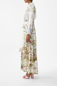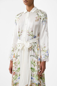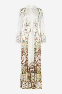 Designed in Australia, the Dressing Room Drama Printed Trench unveils a black base fused with florals and gilded arches, echoing the regal opulence of the Palace of Queluz—a poetic nod to throne rooms and the queen's dressing sanctuary. Lovingly handcrafted, this maxi length trench coat with side splits is adorned with signature CAMILLA crystal embellishments. - Button Through Front - Maxi Length With Side Splits - Crystal Embellishment - Lace Trims SKU 00035685-DRESDRAM-XS Fabric and Care 100% SILK CHARMEUSE Silk satin embodies a sumptuously smooth finish that offers a rich buttery touch to the skin. As a result of the satin weaving technique, it masterfully creates a fuller bounce to the body and drape details.