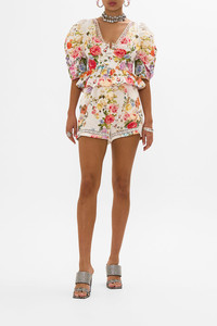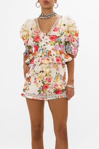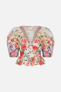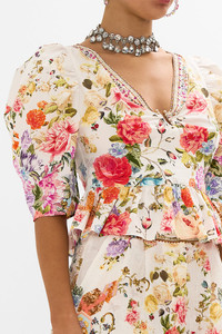 The Sew Yesterday Puff Sleeve Top With Hardware wanders through a luscious garden of beautiful blooms adorned with delicate gold chains and captivating jewels. This CAMILLA puff sleeves top features a fitted bodice that flows into a gathered frill hemline. The short sculptural puff sleeves taper to above the elbow to create a statement silhouette. Explore more from the Wonderkind collection. - Lovingly Handcrafted - Designed in Australia - CAMILLA Ready-To-Wear - Crystal embellishment - U - ring hardware - Puff sleeves - V neck - Hem frill SKU 00029146-SEWYESTE-XXS Size and Fit Our model wears a CAMILLA S and is 5'10 (178cm) tall. Her standard dress size is an AU 10. She has a 32in (83cm) bust, 35in (89.5cm) hips and a 25in (66cm) waist. Camilla S = AU10 / UK10 / US6 Fabric and Care 100% COTTON Organic cotton poplin is sumptuously smooth with a crisp, refined weave. This lightweight silken fabric drapes beautifully and is ideal for sleek contours and tailored, defined styles.