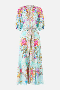 The Bazaar Blooms Puff Sleeve Midi Shirt Dress With Tie is a handcrafted linen silhouette designed by our in house artisans. Reimagined in an exclusive limited edition print, this shirt dress features romantic puff sleeves and a generous waist tie. A button front bodice falls into a tiered skirt that cascades to a mid length hemline, while intricately placed crystal embellishments finish the dress with luminous detail. - 100% Linen - Tiered Midi Skirt - Short Puff Sleeves - Button Through Front Bodice - Waist Tie - Crystal Embellishment SKU 00041080-BAZABLOM-XXS Fabric and Care 100% LINEN