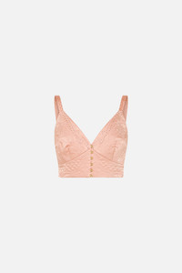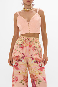 The Blossoms And Brushstrokes Quilted Bralette wanders through a realm of delicate art nouveau swirls of pink blush tones and rich ruby red florals. An exquisite cropped top that showcases a fitted bodice with shaped bust cups that falls to high waist level. The wide adjustable straps and shirred elastic back panel ensure a chic personalised fit. Explore more from the Wonderkind collection. - Lovingly Handcrafted - Designed in Australia - CAMILLA Ready-To-Wear - Crystal embellishment - Cropped length - Adjustable straps - Shaped bust cups - Button front detail - Shirred elastic back panel - Can be worn as a matching set SKU 00028567-BLOSBRUS-XS Size and Fit Our model wears a CAMILLA S and is 5'10 (178cm) tall. Her standard dress size is an AU 10. She has a 32in (83cm) bust, 35in (89.5cm) hips and a 25in (66cm) waist. Camilla S = AU10 / UK10 / US6 Designed and fitted true to size, take your normal size Fabric and Care 100% SILK Silk satin embodies a sumptuously smooth finish that offers a rich buttery touch to the skin. As a result of the satin weaving technique, it masterfully creates a fuller bounce to the body and drape details.