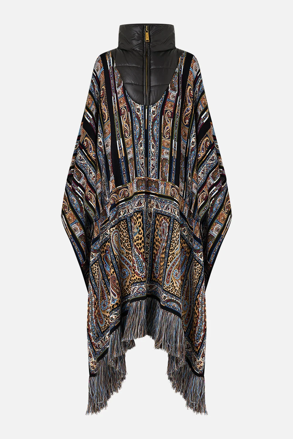 The Istanbul Animalia Quilted Collar Knit Poncho is a handcrafted bamboo silhouette designed by our in house artisans. Reimagined in an exclusive limited edition print, this poncho is cut in a relaxed fit and features a jacquard knit body for elevated texture. It's adorned with a quilted collar for luxurious comfort and is finished with a fringed hemline, adding playful movement with every step. - Relaxed Fit - Quilted Collar - Jacquard Knit Body - Fringed Hem SKU 00037199-ISTAANIM-O/S Size and Fit Our model wears a CAMILLA O/S and is 5'10 (178cm) tall. Her standard dress size is an AU 10. She has a 32in (83cm) bust, 35in (89.5cm) hips and a 25in (66cm) waist. Designed as an oversized silhouette. Take your normal size, or select one size smaller for a neater fit. Fabric and Care 100% BAMBOO 0